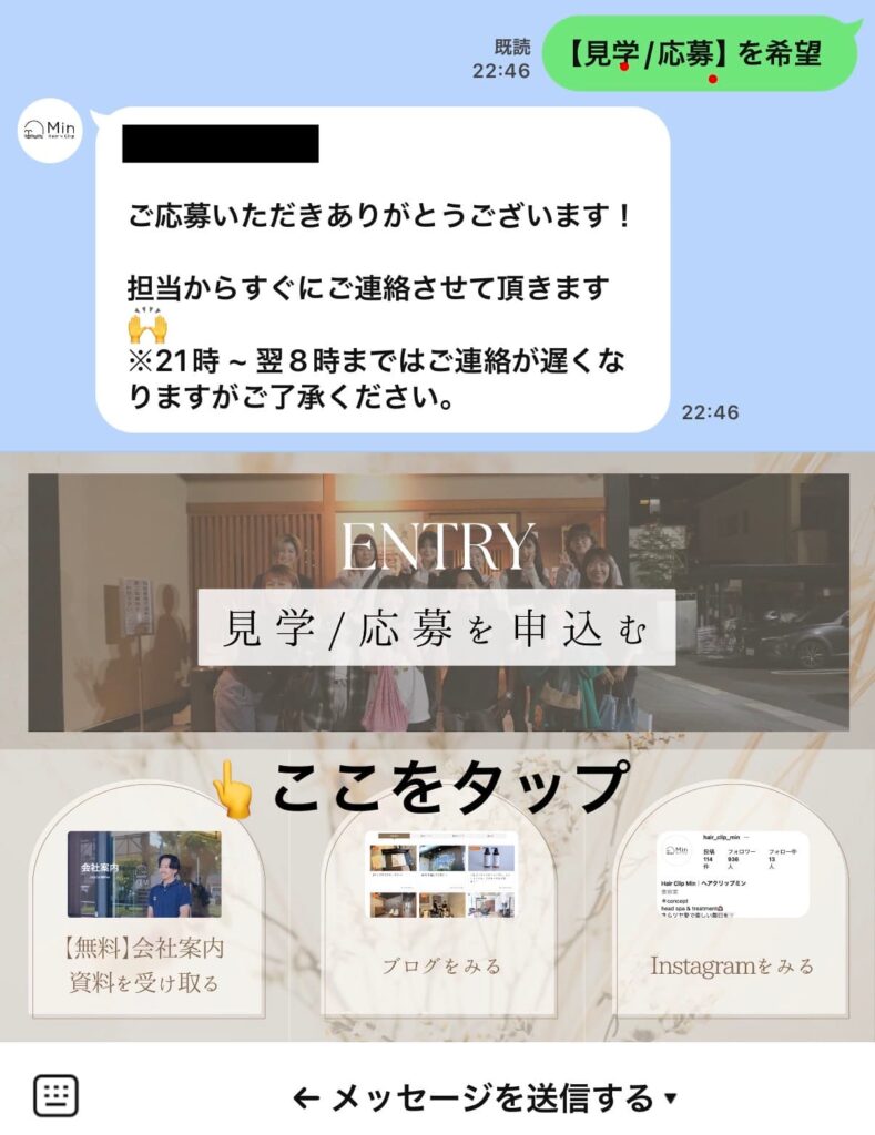 下記ボタンからLINE友だち追加後「見学/応募する」ボタンをタップすれば応募が完了します。