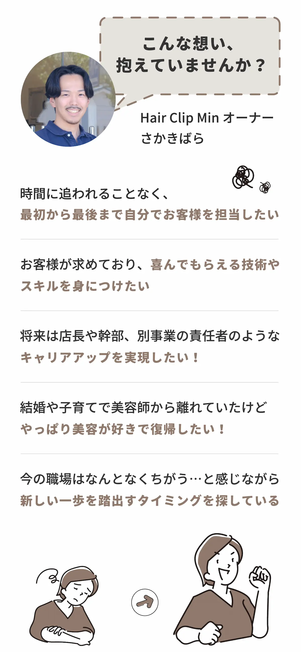 Minはこんな思いを抱えたスタイリストの方が活躍できる場をご用意致します。店長など幹部になりたい人も大歓迎です。本気で挑戦する気持ちさえあれば、必ずあなたを全力でサポート致します!